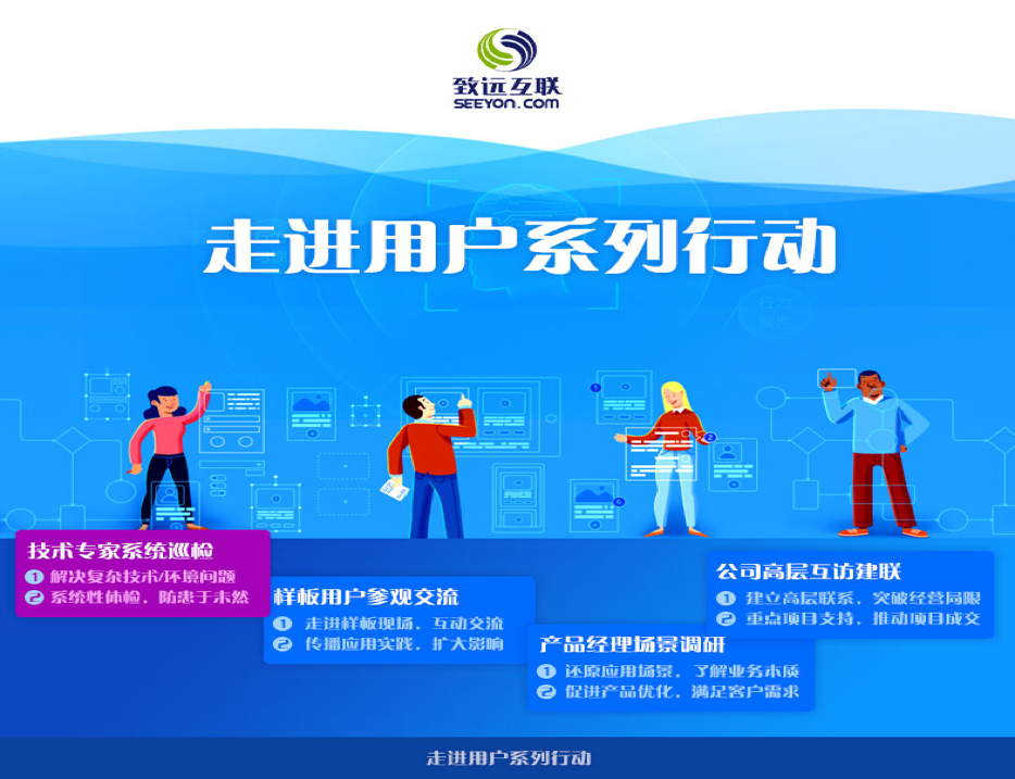 为了帮助用户“解决大并发、大数据量、复杂部署环境,导致的系统运行性能、稳定性等问题”,并“刷新大客户研发主动跟踪名录,定期巡检用户系统运行状态,事前预防,化风险于未然”,致远互联客户经营中心联合研发中心,正式启动“走进用户系列行动——第1期-研发技术专家走进用户”。
