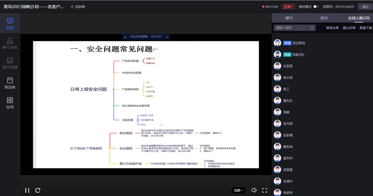 9月27日下午,致远青岛·扬帆计划 | 2023老客户知识讲堂年度最后一期如约召开,为满足更多异地老客户及伙伴客户顺利参会,培训采取线上直播模式,本期主要针对运维常见案例及日常应用进行详细讲解,培训吸引了近30位老客户在线参与。