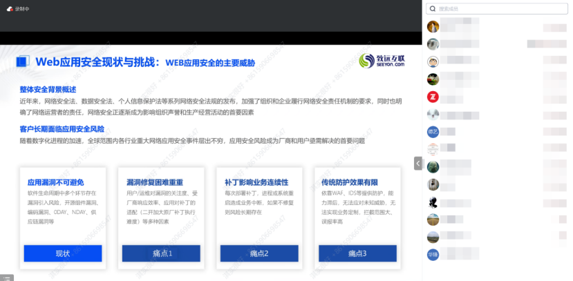 10月26日下午,2023致远浙江“蒲公英计划”之致远主动防御解决方案(第四期)如约召开,为满足更多异地老客户及伙伴客户顺利参会,培训采取线上直播模式,本期主要针对致远主动防御解决方案进行详细讲解,培训吸引了近20位老客户在线参与。