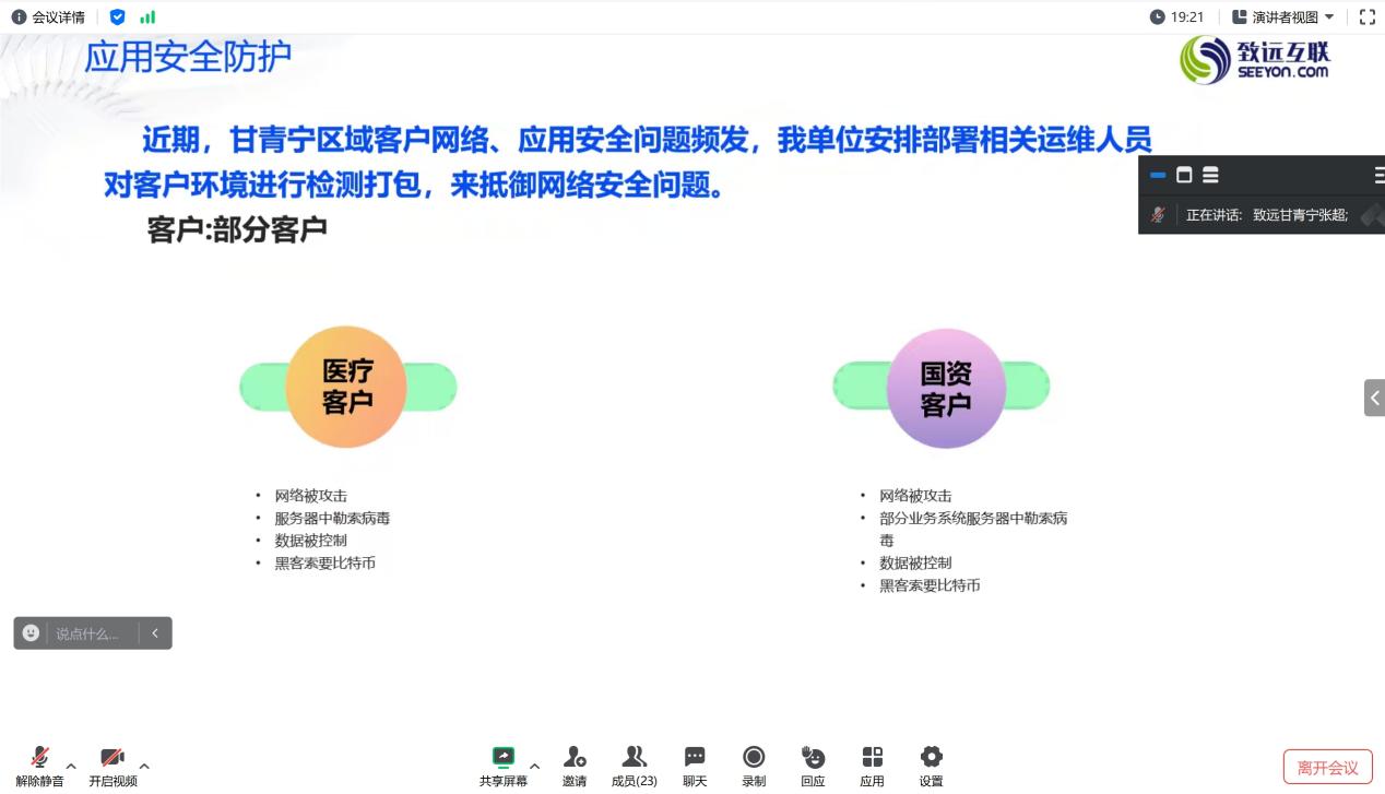 会议伊始,由致远甘青宁区运维顾问张超介绍了近期老客户遇到的安全问题及公文问题,张超老师列举了老客户实际遇到的问题,并对问题深入剖析。
