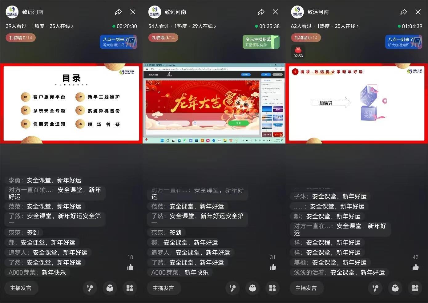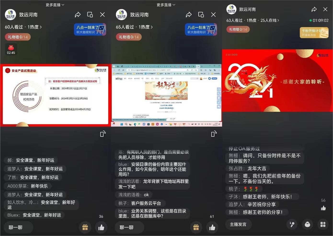 为了进一步加强客户假期安全预防意识,确保客户系统的安稳运行,河南区于2024年2月1日策划了一场“致享课堂龙年新篇—安全防线”培训,本次培训以视频号直播的创新方式开展,吸引了众多客户的积极参与,取得了圆满成功。