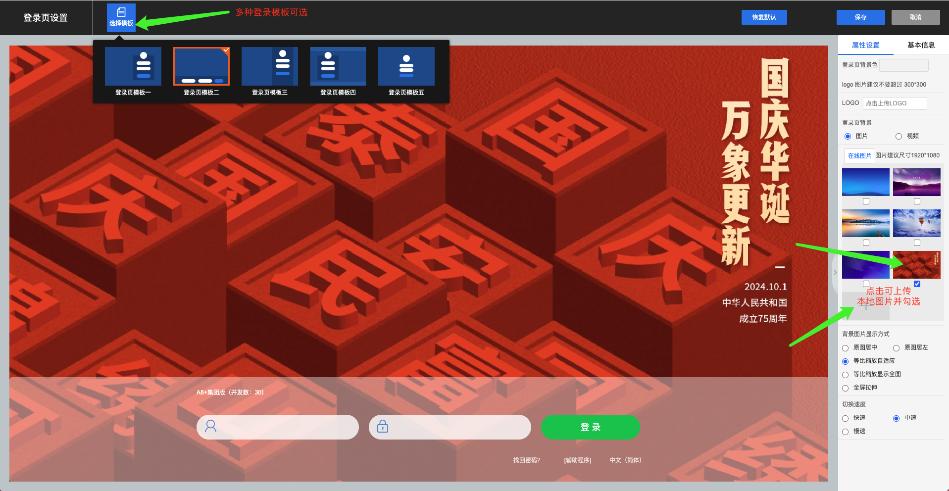 2)添加登录页背景图片,本地导入后即可勾选设置,显示方式建议切换为等比缩放或全屏拉伸显示,设置完成后保存即可。