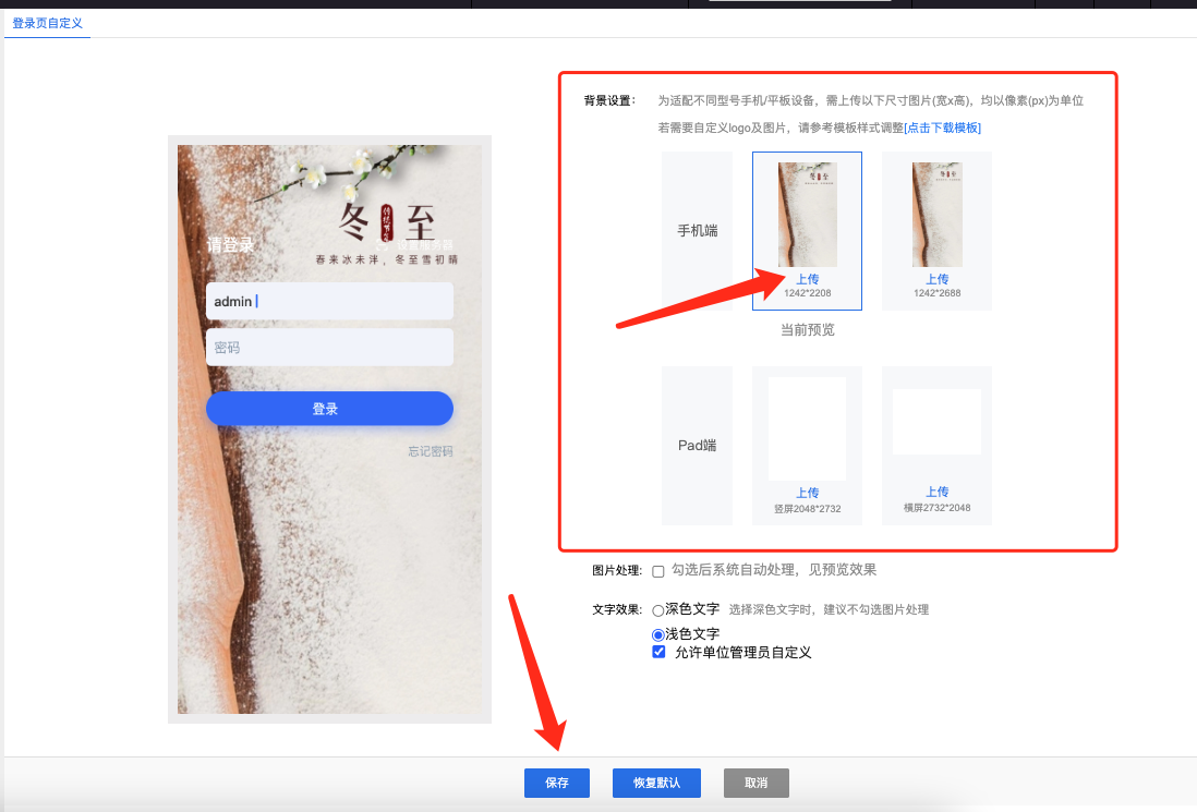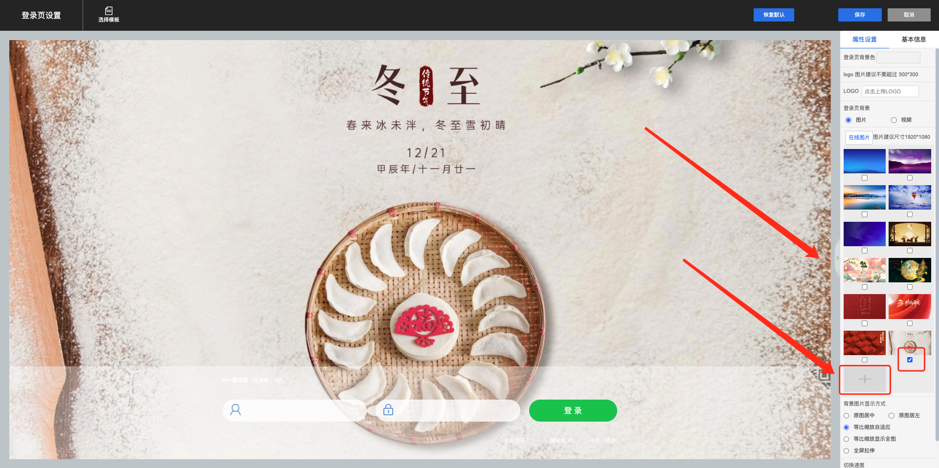 2)添加登录页背景图片,本地导入后即可勾选设置,显示方式建议切换为等比缩放或全屏拉伸显示,设置完成后保存即可。