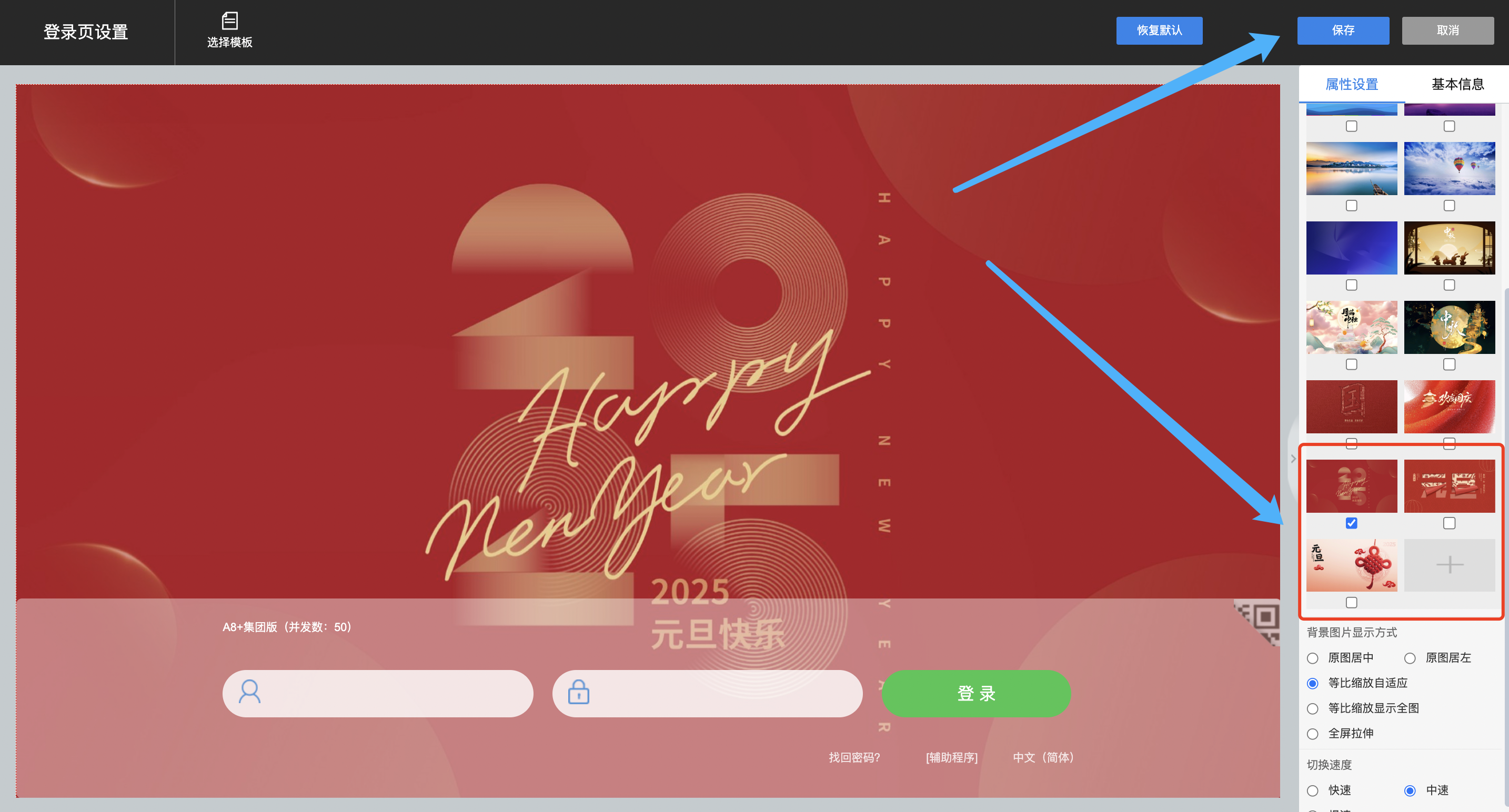 2)添加登录页背景图片,本地导入后即可勾选设置,显示方式建议切换为等比缩放或全屏拉伸显示,设置完成后保存即可。