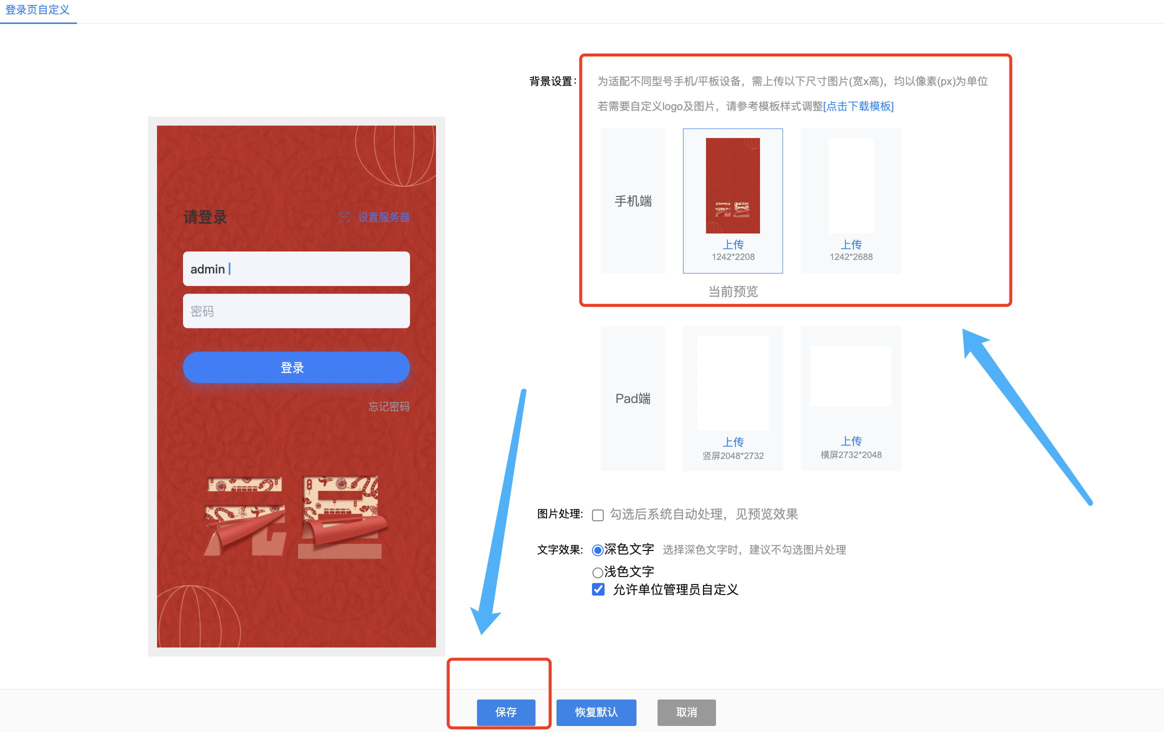 2)上传手机端、Pad端各尺寸适配图片后保存即可。