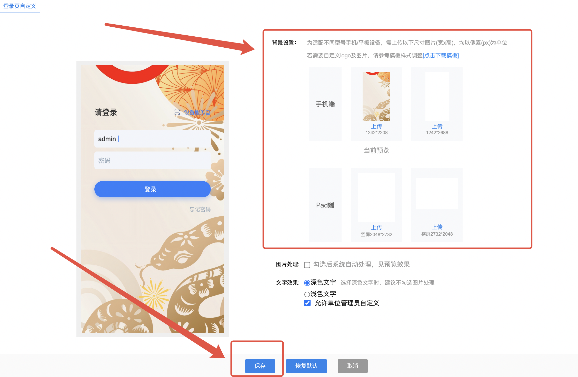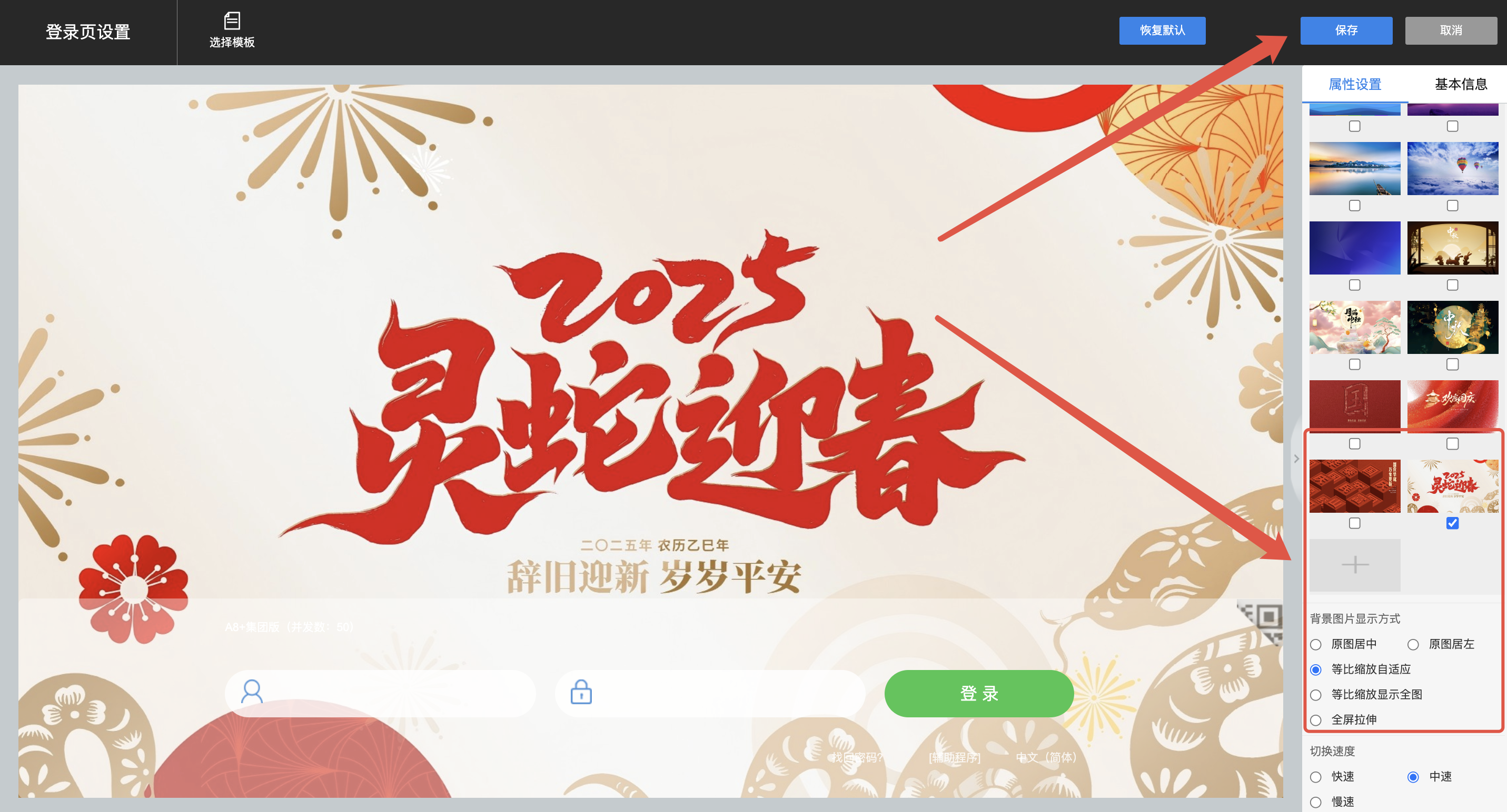2)添加登录页背景图片,本地导入后即可勾选设置,显示方式建议切换为等比缩放或全屏拉伸显示,设置完成后保存即可。