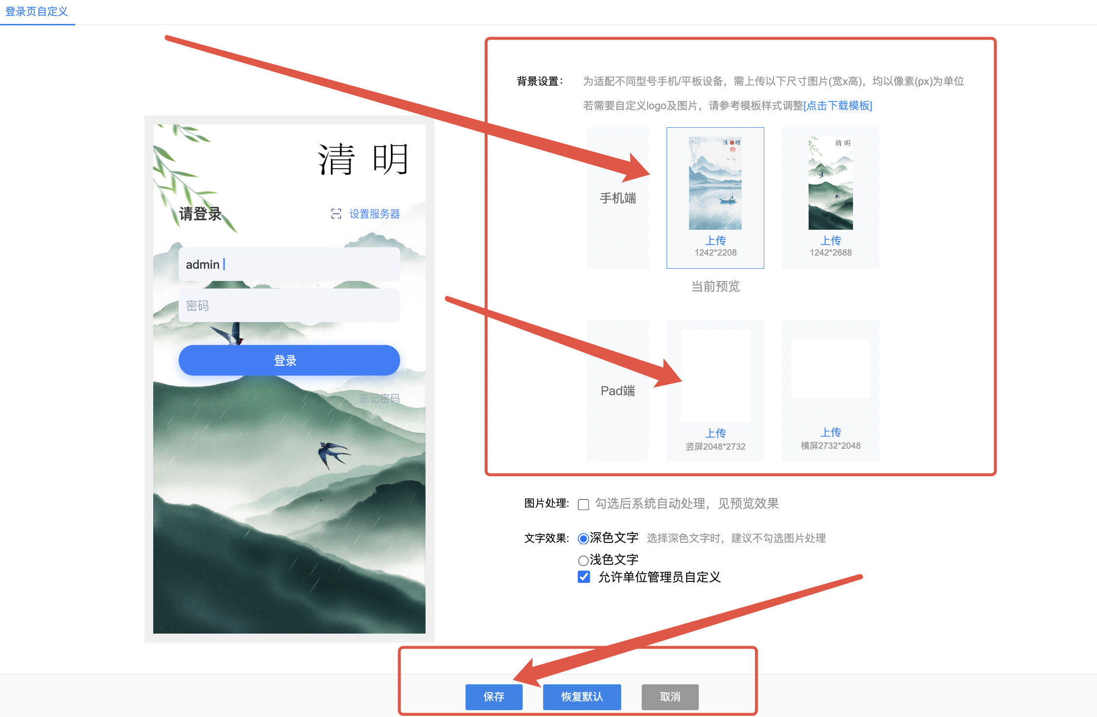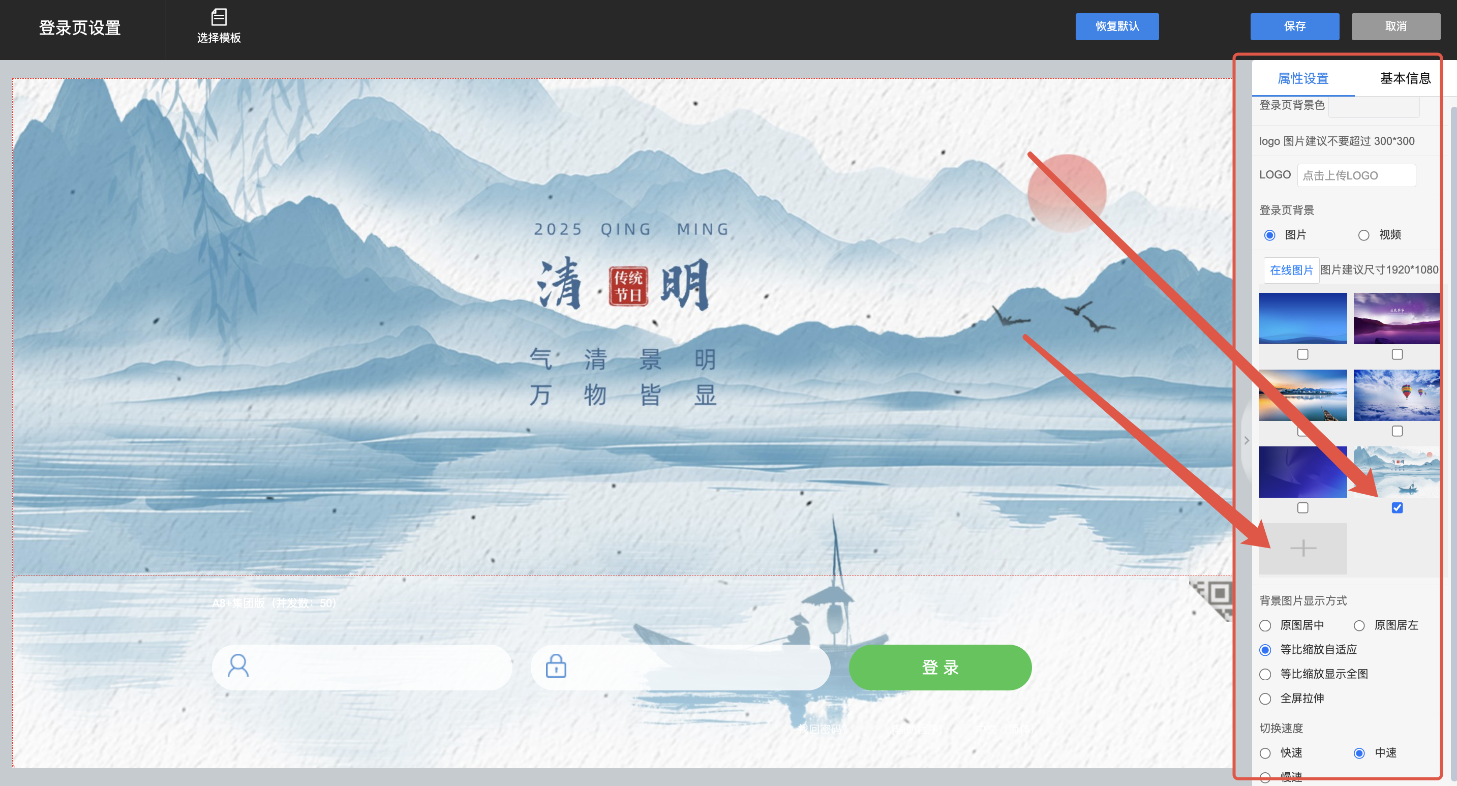 2)添加登录页背景图片,本地导入后即可勾选设置,显示方式建议切换为等比缩放或全屏拉伸显示,设置完成后保存即可。