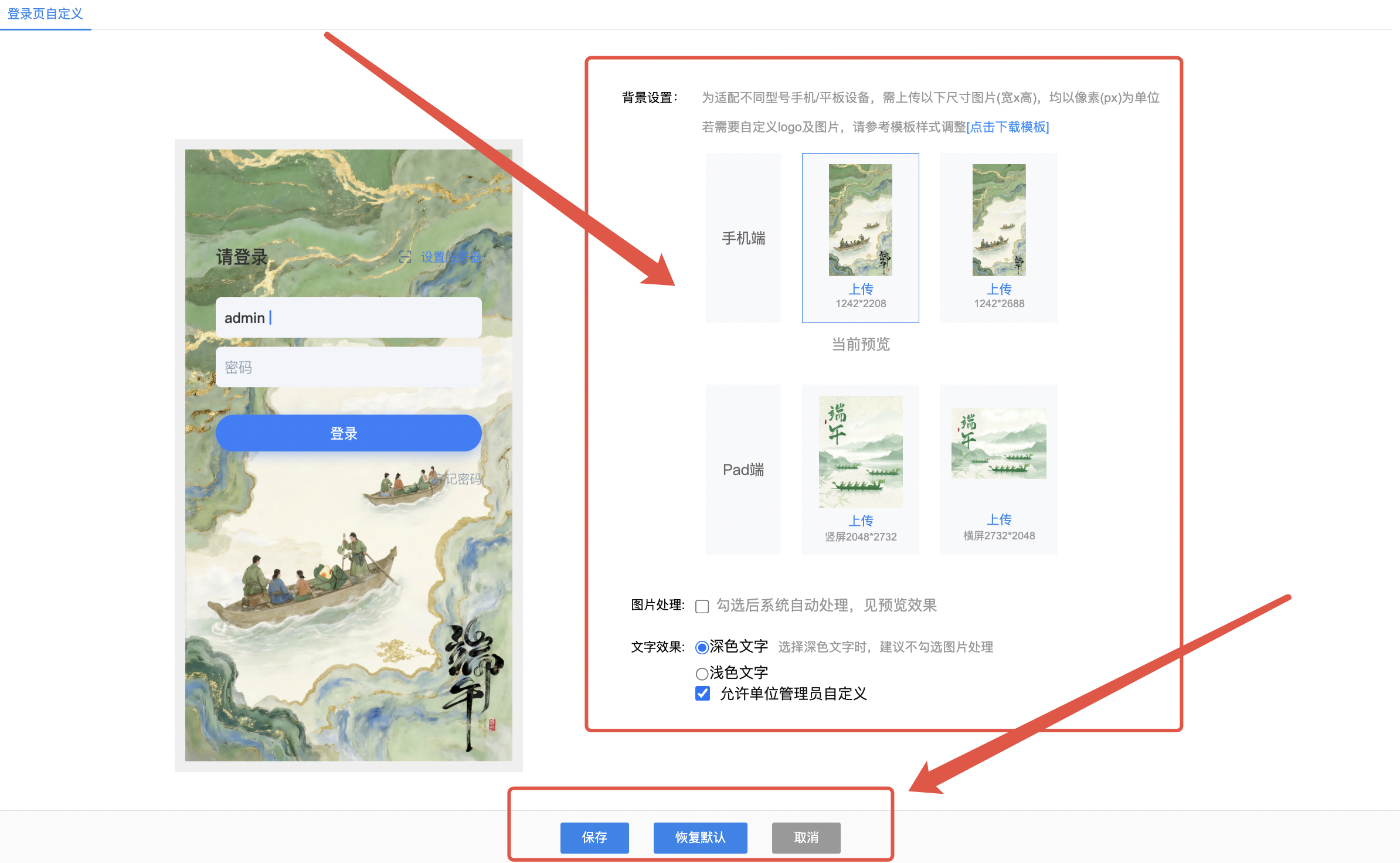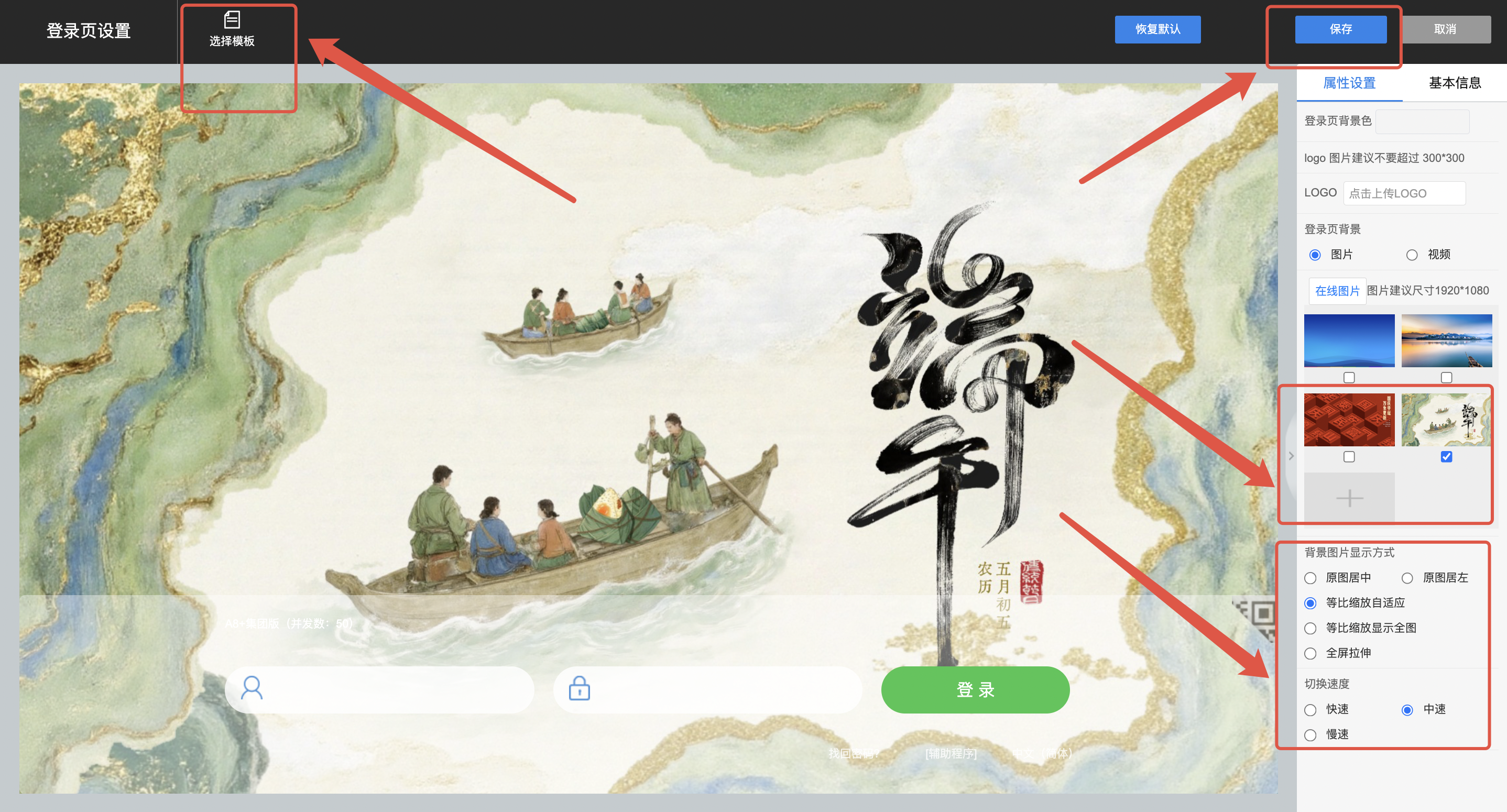 2)添加登录页背景图片,本地导入后即可勾选设置,显示方式建议切换为等比缩放或全屏拉伸显示,设置完成后保存即可。