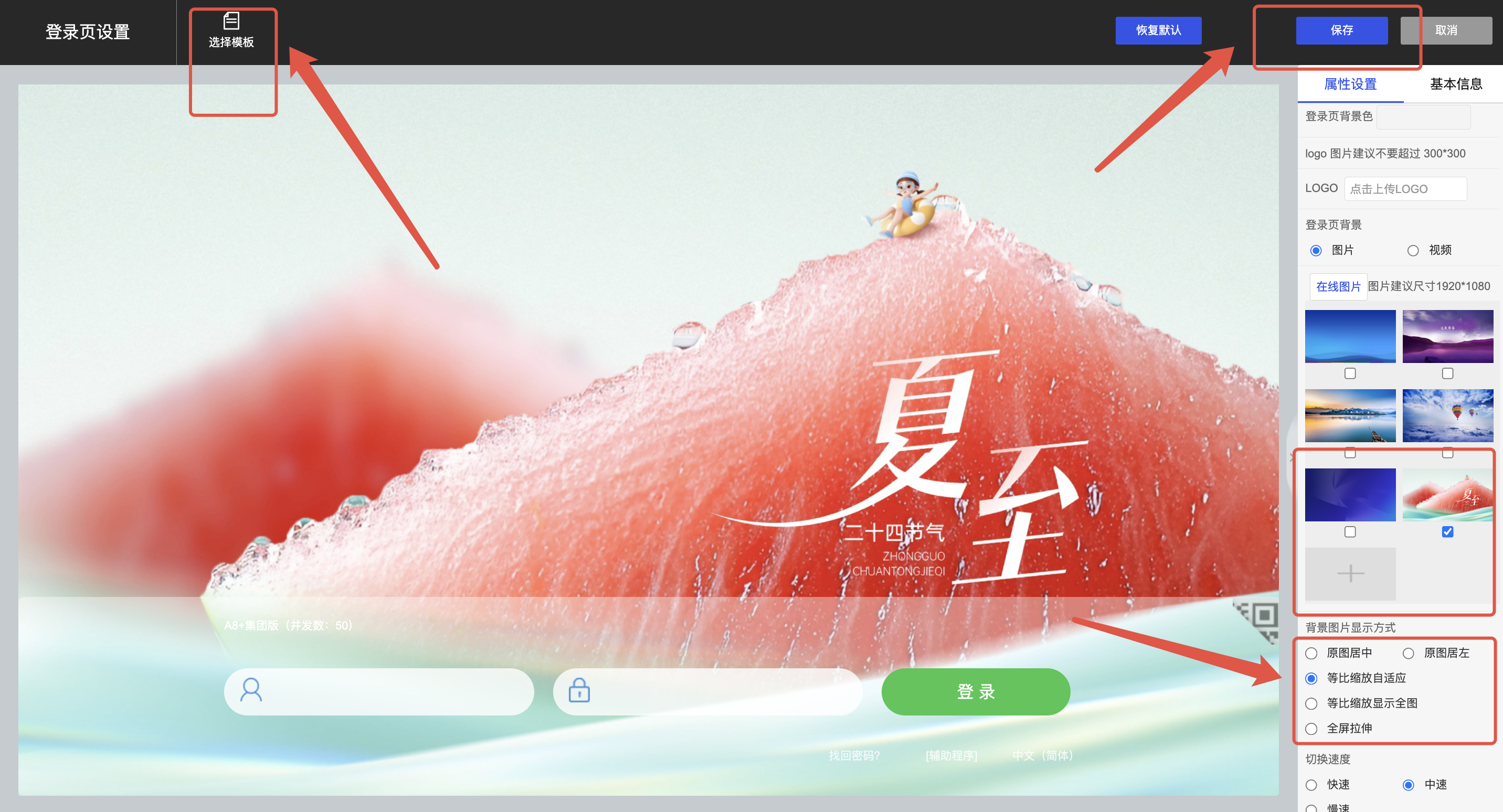 2)添加登录页背景图片,本地导入后即可勾选设置,显示方式建议切换为等比缩放或全屏拉伸显示,设置完成后保存即可。