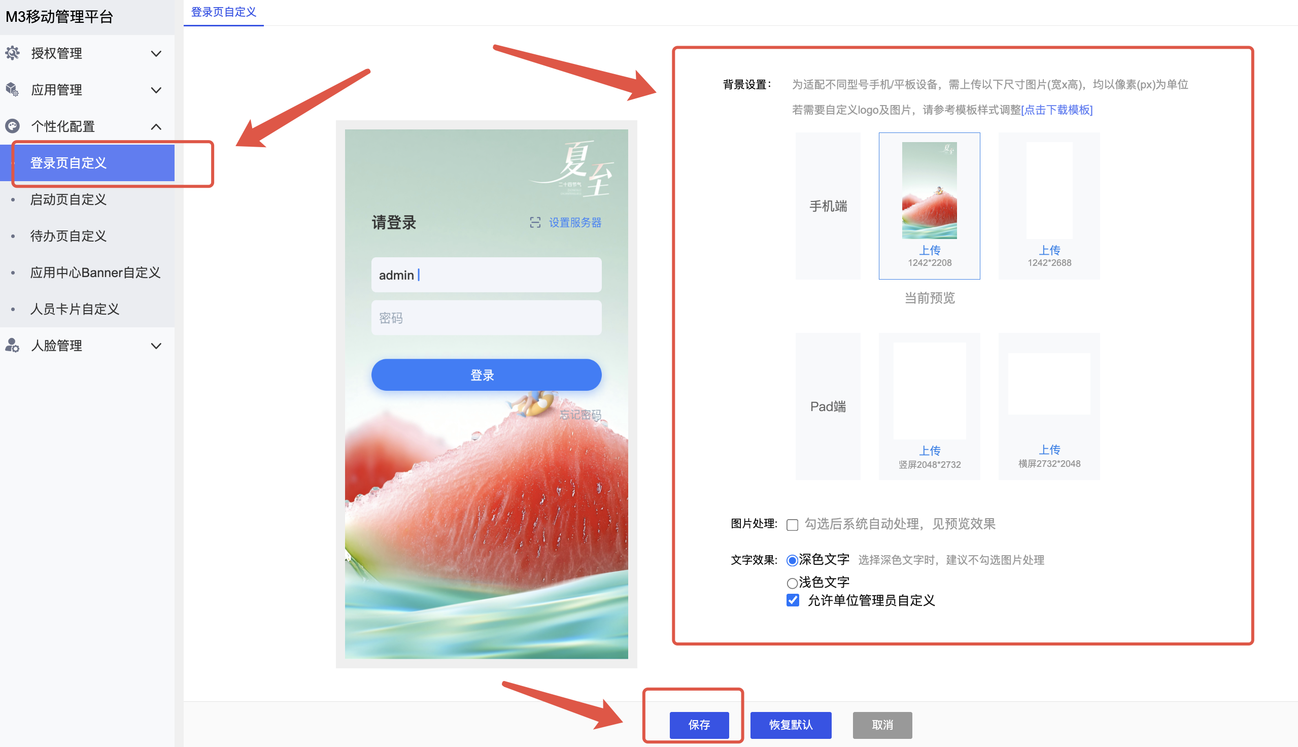 1)登录单位/集团管理员账号,进入菜单:“M3移动管理平台 - 个性化配置 - 登录页自定义”。