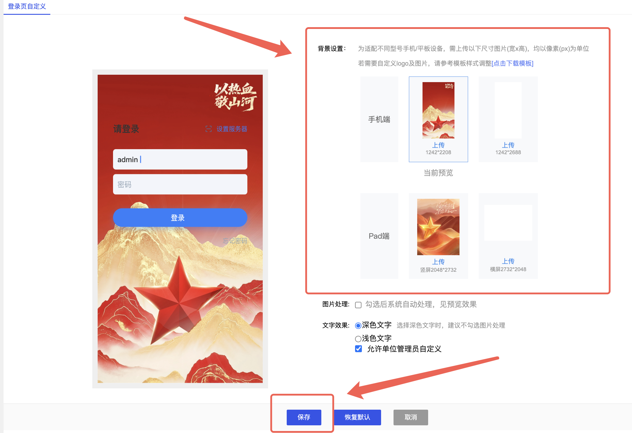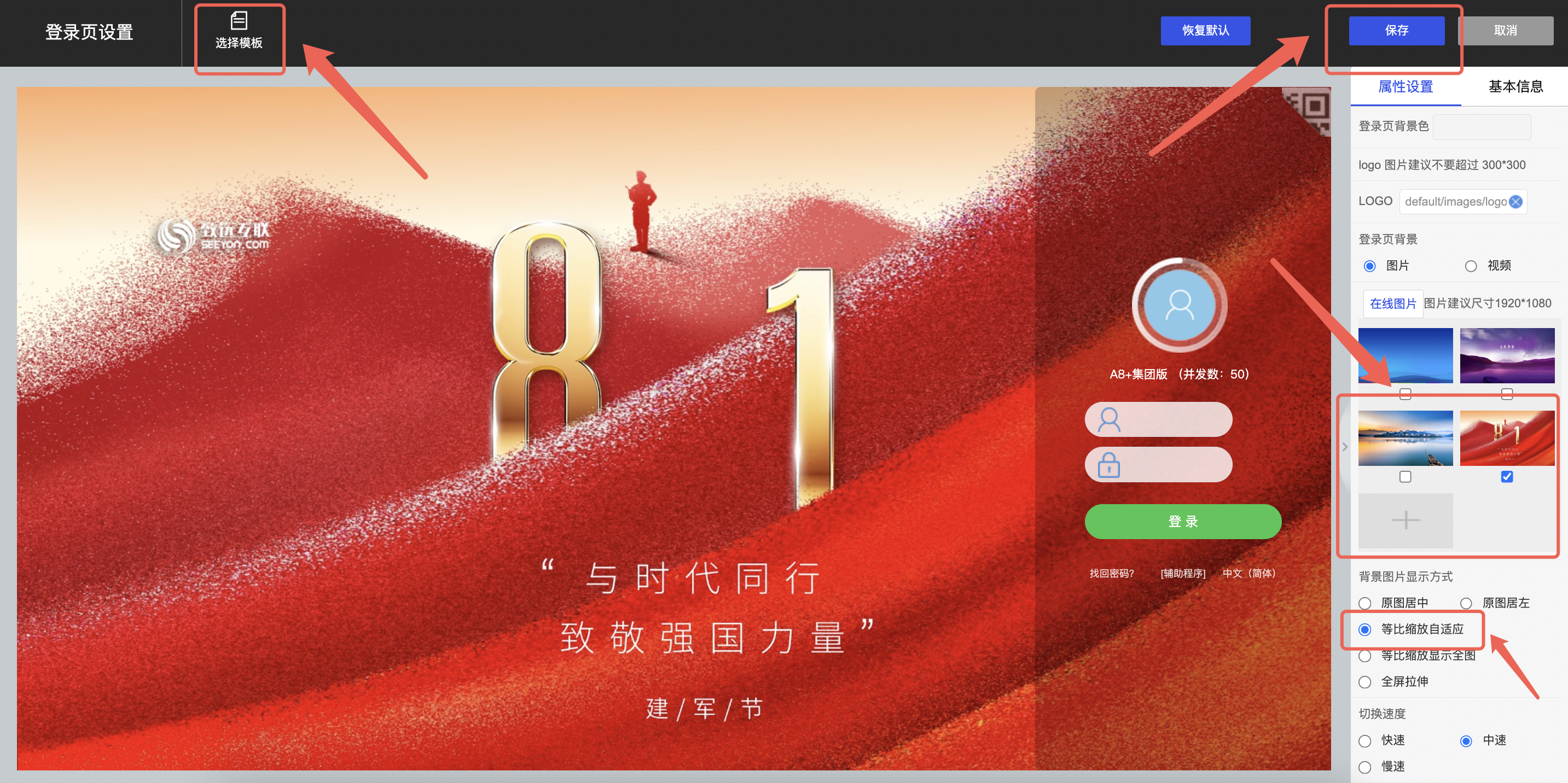 2)添加登录页背景图片,本地导入后即可勾选设置,显示方式建议切换为等比缩放或全屏拉伸显示,设置完成后保存即可。