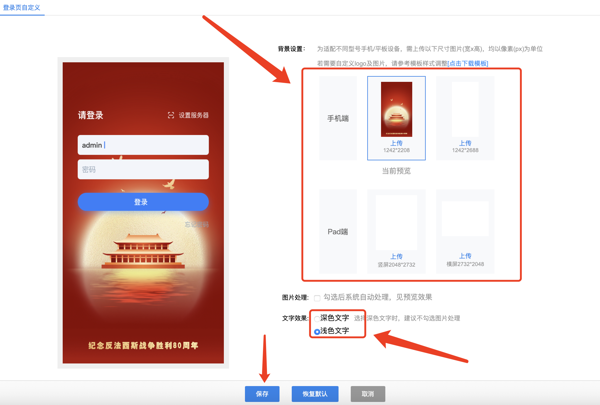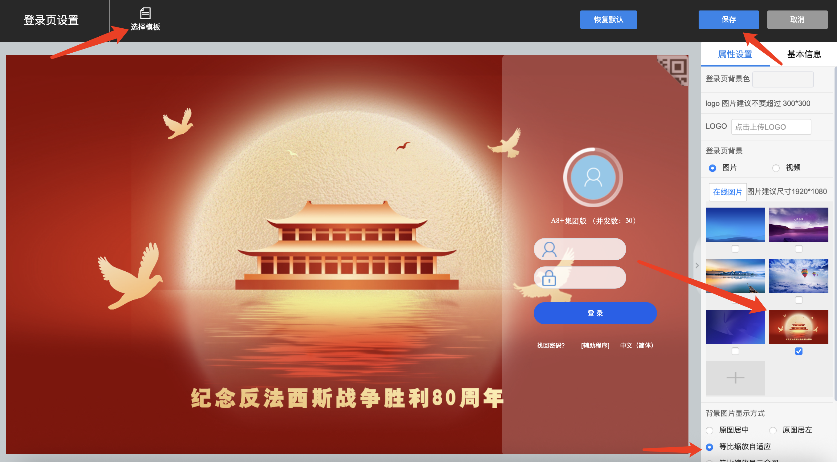 2)添加登录页背景图片,本地导入后即可勾选设置,显示方式建议切换为等比缩放或全屏拉伸显示,设置完成后保存即可。