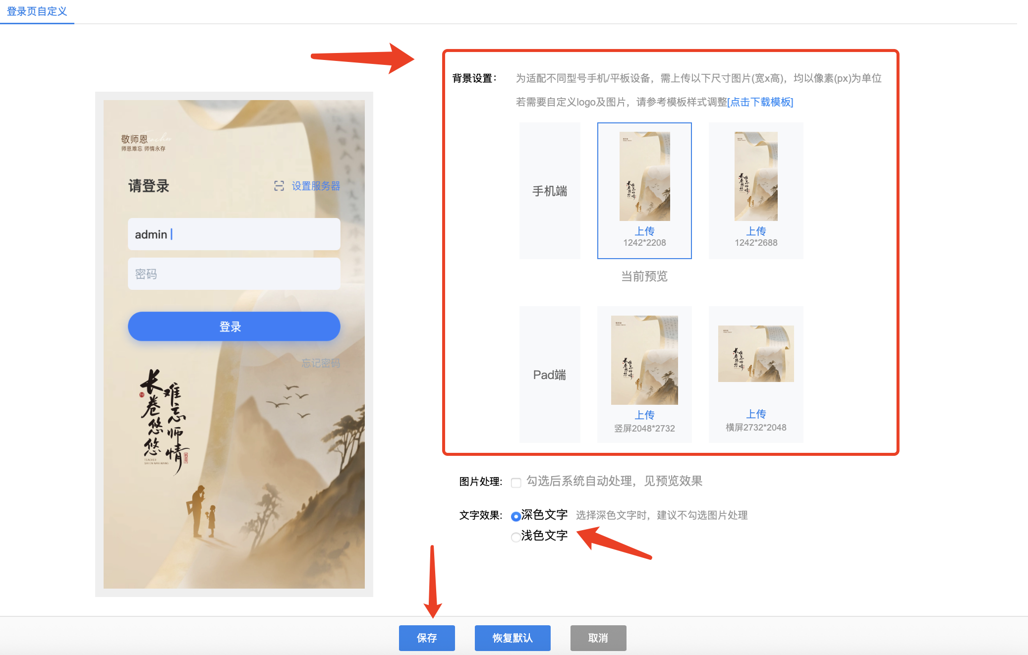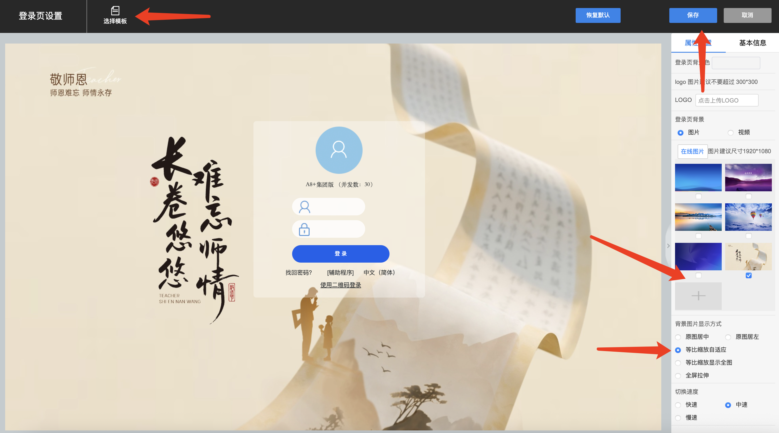2)添加登录页背景图片,本地导入后即可勾选设置,显示方式建议切换为等比缩放或全屏拉伸显示,设置完成后保存即可。
