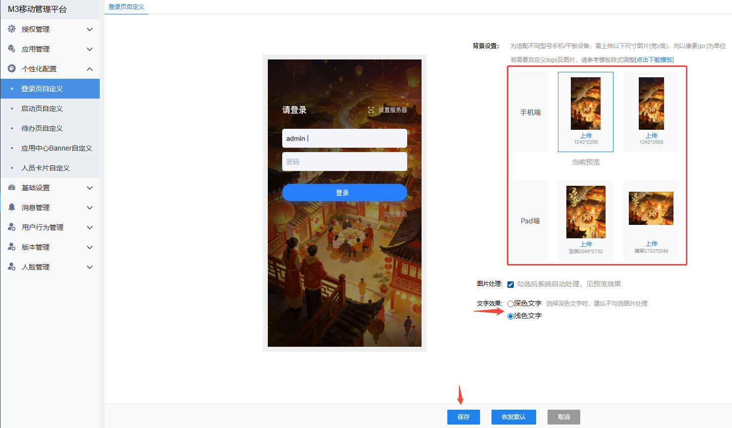 1)登录单位/集团管理员账号,进入菜单:“M3移动管理平台 - 个性化配置 - 登录页自定义”