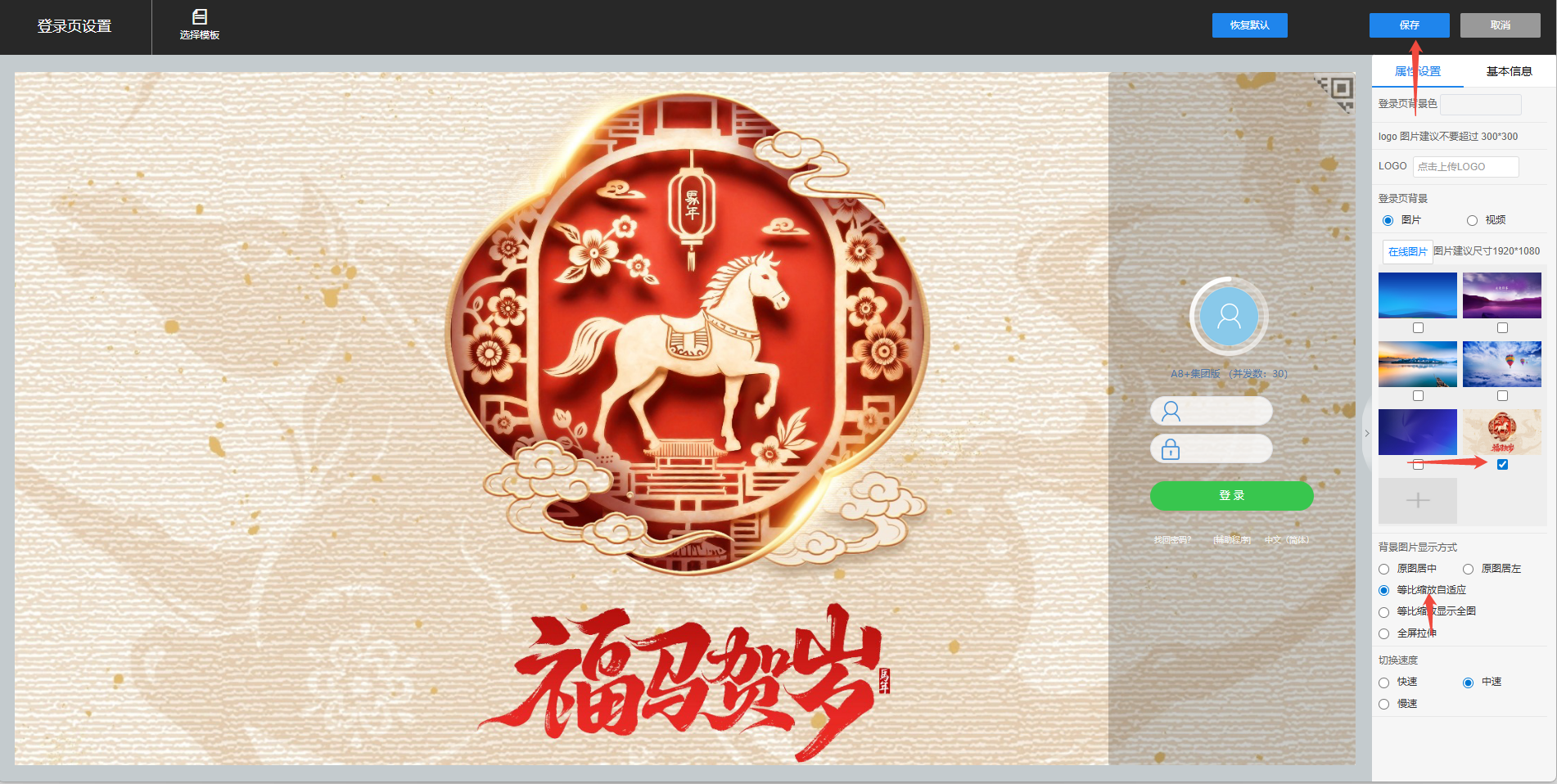 2)添加登录页背景图片,本地导入后即可勾选设置,显示方式建议切换为等比缩放或全屏拉伸显示,设置完成后保存即可。